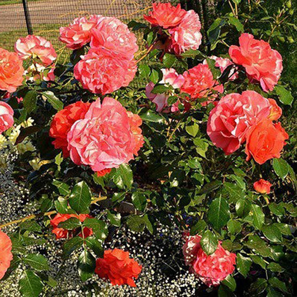 Rosen blomstrer to ganger, men i den første blomsten er knoppene mer effektive. De er veldig frodige med en rosa-oransje farge, tett dobbelt, over tid blir de bringebærrosa i fargen. Løvverket er dekorativt og skinnende, med 5-7 blomster på hver skyte. Frodig busk, opptil 80 cm høy, vokser raskt på forskjellige jordarter. Brødrene Grimm har en mild aroma. Den tåler vinteren godt, og er motstandsdyktig mot varme og regn.