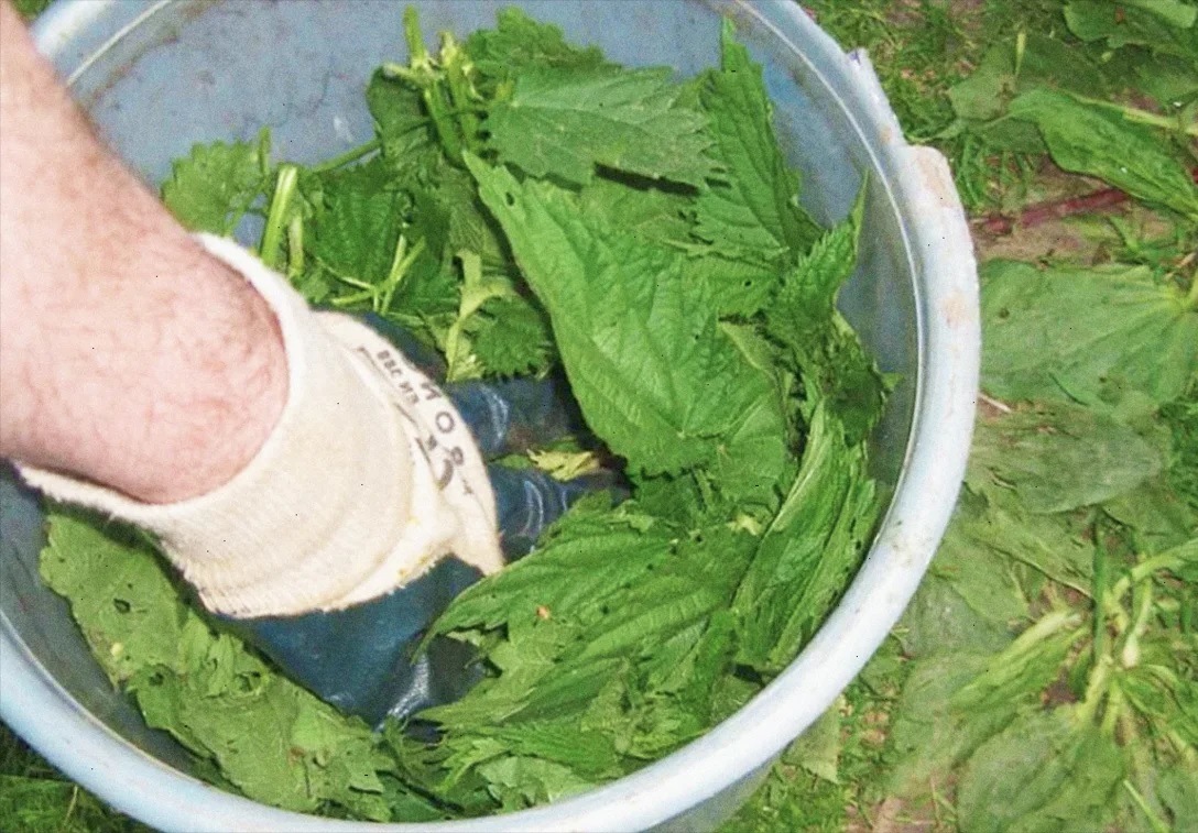 - Brennesleinfusjon - hjemme kan du lage en infusjon fra bladene, røttene og stilkene til planten, du kan ikke ta frø og blomster. Ferske råvarer helles i en bøtte halvveis, og helles deretter med kokende vann. Verktøyet skal tilføres i to dager. For at gjæringen skal være så aktiv som mulig i denne perioden, må du regelmessig blande innholdet i bøtta.