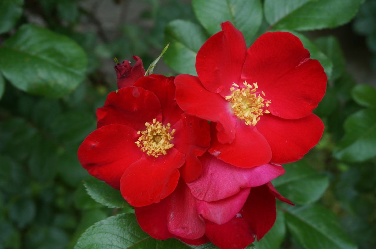 Moyes-rosearten inneholder flere dekorative blomster med stor flaskefrukt og knallrøde blomster.Bladene er knallgrønne, mot bakgrunnen ser blomstene spesielt imponerende ut.