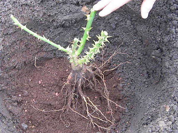 - Stammen av rosen kastes gradvis med jorden (i en sirkel), jorda komprimeres.