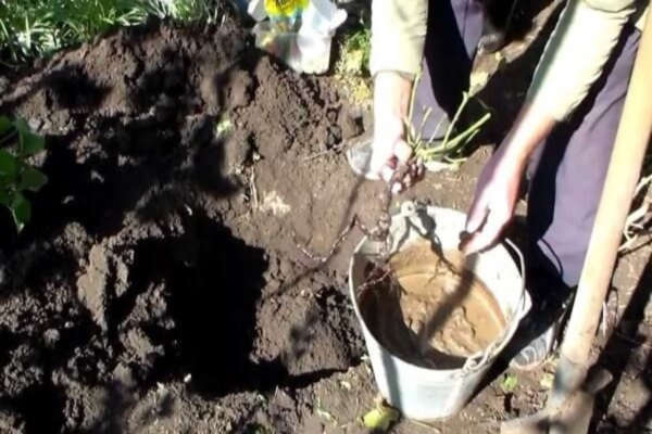- En frøplante med et godt utviklet rotsystem plasseres i en vekststimulerende løsning. Du må først trimme røttene og toppen.
