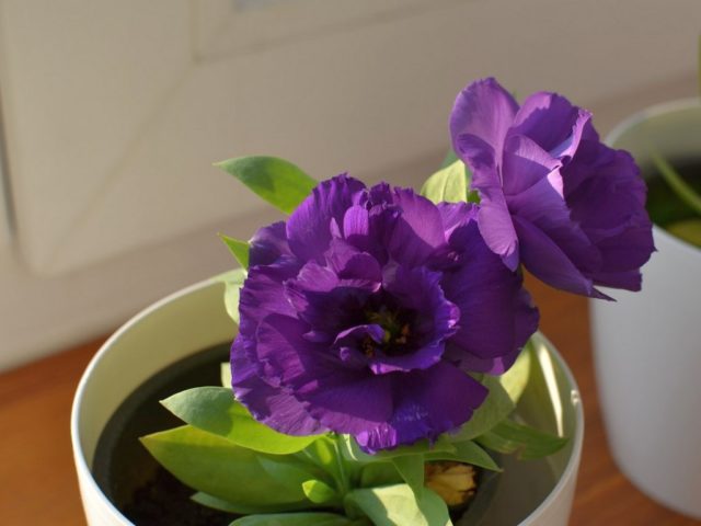 Lavt voksende eustoma-varianter er ideelle for innendyrking. Planter er kompakte og vokser ikke mer enn 20 cm i høyden. Blomstene har en gjennomsnittlig diameter på 5 cm. Blomstene kontrasterer veldig pent mot bakgrunnen til en kompakt busk i en gryte.