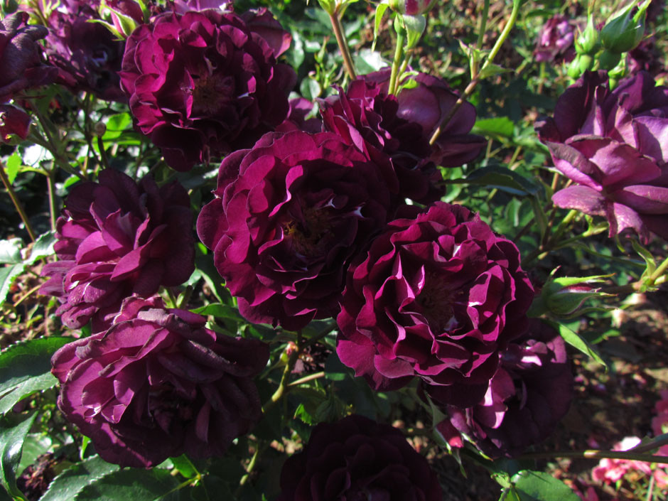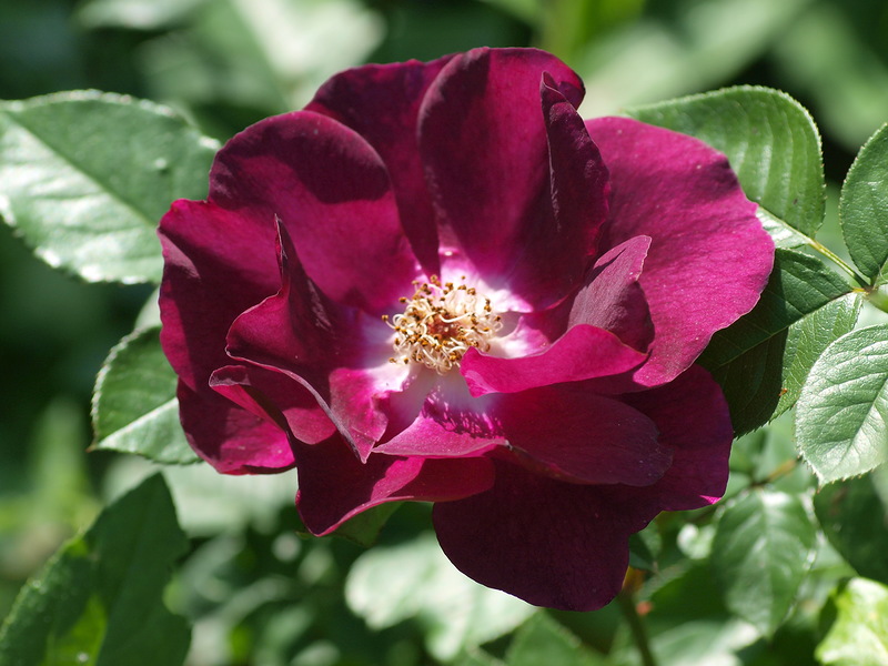 De små kuppeblomstene av rosen er innrammet og lilla i fargen. Den blomstrer i løpet av den første sommermåneden.