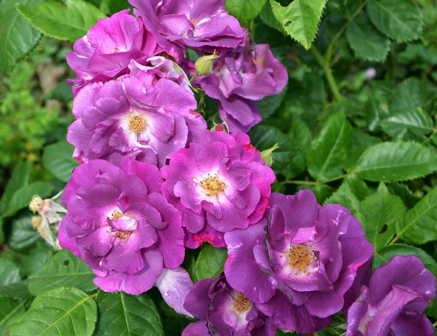 Disse purpurfargede roseblomstene er nærmest blå.Blomsterbladene er halvdoble med gyldne støvdragere i det hvite sentrum.