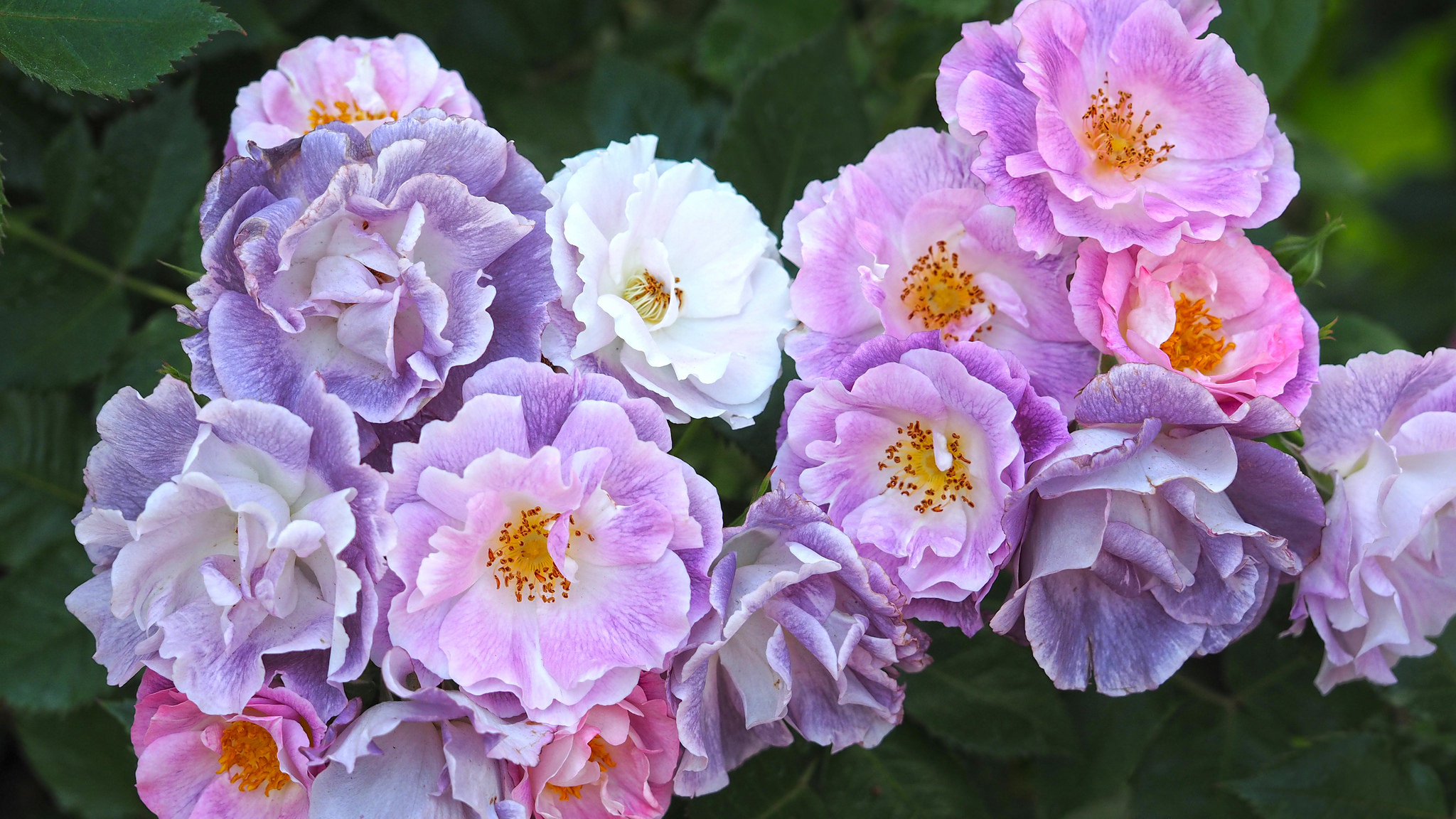 Mørke lilla roser av sorten Midnight Blue har 17-25 kronblader og lyse gule stammer i midten. De har en sterk krydderaroma.