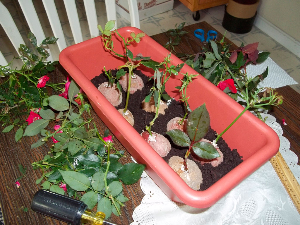 Det er også en uvanlig måte å rote stiklinger av en rose fra en bukett - ved hjelp av unge poteter. På tilberedte stengler ca 20 cm lange fjernes blader og torner. En grøft 15 cm dyp tilberedes på stedet. Sand helles i bunnen i et lag på 5 cm. Stiklene stikkes fast i potetene og legges i en form i en grøft i en avstand på 15 cm. Dryss med jord og dekk til med krukker.