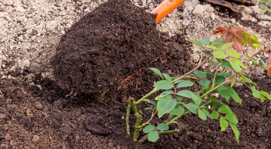Planten plasseres i det forberedte hullet, og legger rotsystemet forsiktig. For at busken skal kunne slå rot godt, bør hovedrøttene være plassert i avstand fra hverandre. Dekk til jorden slik at rotkragen skjules med minst 5 cm. Dette gjøres for å beskytte røttene mot værforhold og for å unngå dannelse av rosen hofter.