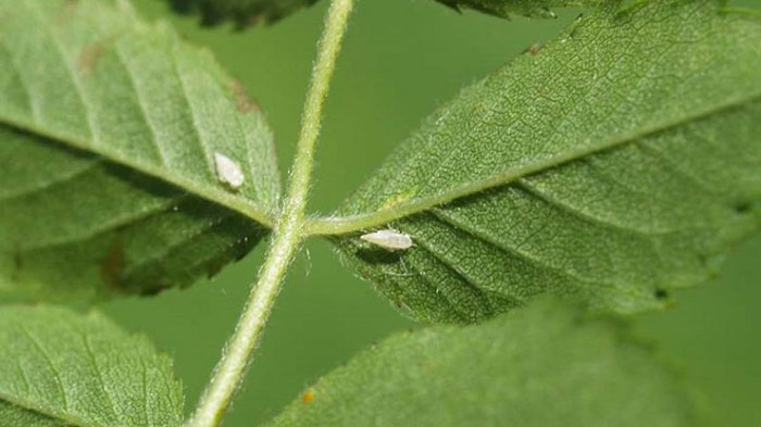 - Rose leaf cicada er et lite gulaktig insekt. Har vinger og hoppende ben. Veldig mobil, smitter raskt naboplanter. Et typisk tegn på en lesjon er hvite flekker på bladbladet. Skadede blader faller av, planten kan dø. De berørte prøvene blir behandlet med Aktara, vanner ved roten og sprayer luftdelen.