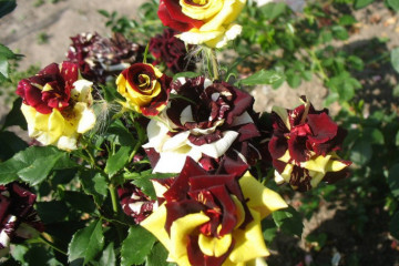 Rosebusk, som stripete flekker blomster pryder i et uvanlig fargevalg, ser veldig imponerende ut ...