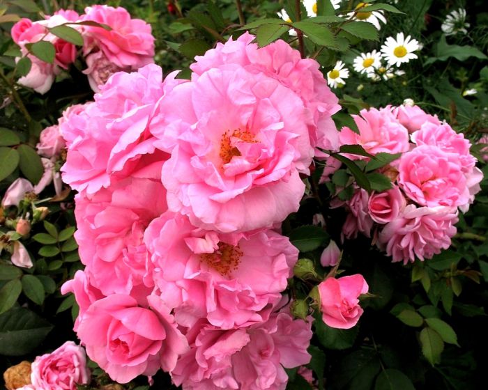 - Louis Audier. En busk med en høyde på opptil 3 m. Blomstene er formet som pioner og har en lys rosa farge. Anlegget brukes til å skape et klassisk engelsk, fransk landskap.