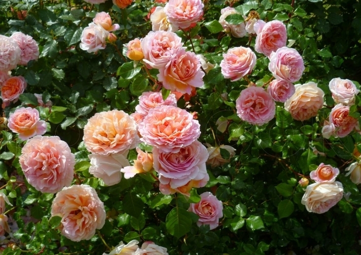 - Abraham Darby. Busker av denne sorten vokser raskt, er motstandsdyktige mot sykdommer, blomstrer 2 ganger i løpet av sesongen med store blomster i varm oransje farge med rosa farge i endene.