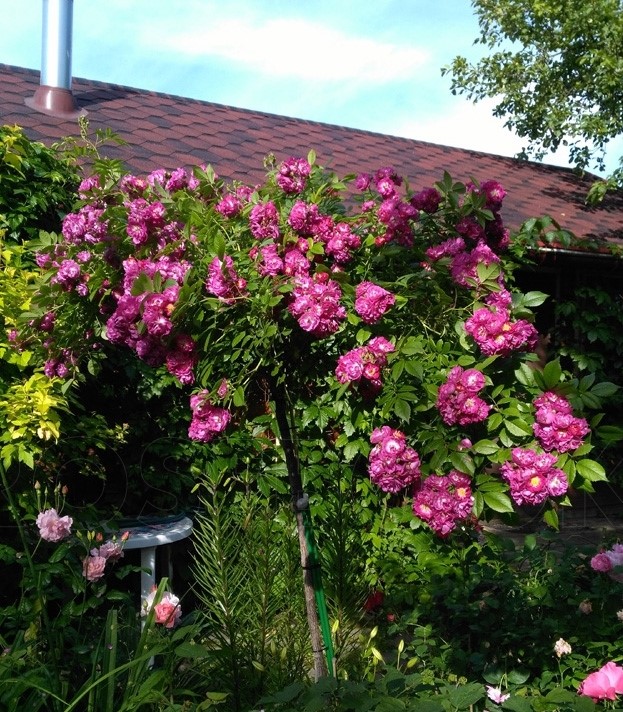 Lilla-lilla blomsterstander fordeles jevnt over plantasjen. Rosen er kjent under flere navn: Flerårig blå, Mehblue, Mehv 9601.