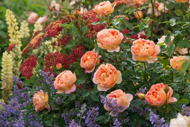 Pat Austin plasseres i blomsterbed og rygg i selskap med planter som er radikalt forskjellige i størrelsen og formen på knoppene eller fargen deres: