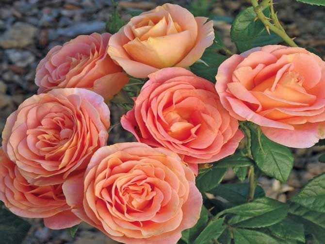 - Storblomstret eller klatring - resultatet av valget mellom vandrere og te, hybridteroser og floribunda. Lengden på grenene er ca 4 m, blomstene er fra 4 cm i diameter, i form ligner de hybridte-roser. Rikelig blomstring.