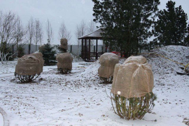 - Den sikreste måten er å bygge et skjold over grenene som et trekantet tak. Hvis vintrene er kalde, burde det ikke være noen sprekker. Omvendt er det nødvendig å gi rosene ventilasjon under varme vintre. Buskene skal ikke komme i kontakt med skjoldene, da det akkumuleres fuktighet på dem, noe som kan føre til at grenene råtner. Ovenfra er skjoldet dekket med en film.
