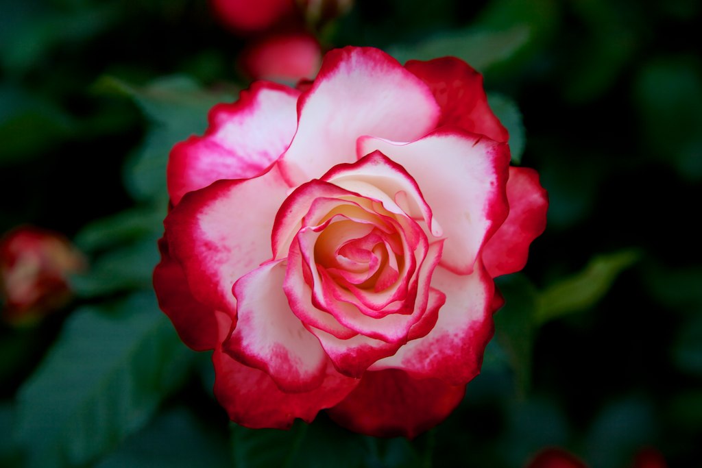 I begynnelsen av blomstringen er rosebud kremaktig med en rød kant i kantene.