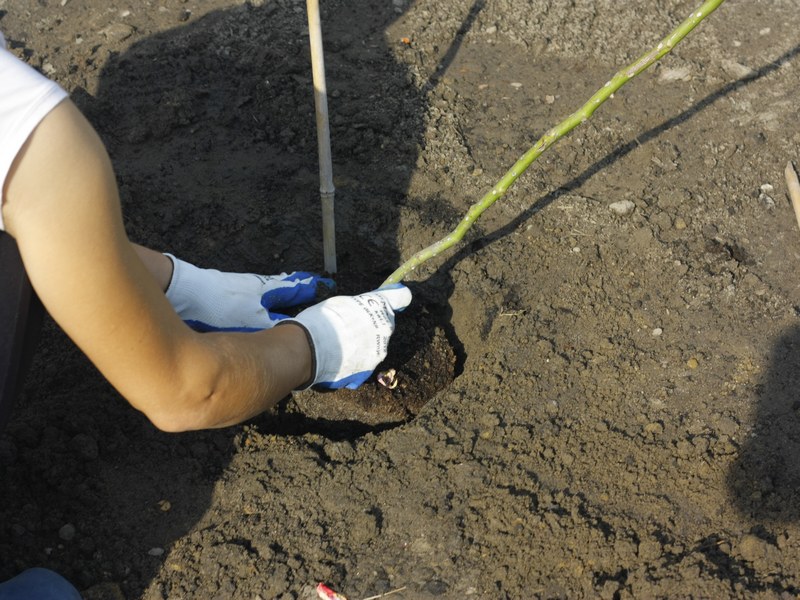 - Stengelen plasseres i en plantegrop og retter rotsystemet. Stammen på treet er plassert i en vinkel på 45 ° mot rotbøyningen. Når du planter, må du sørge for at rotkragen er 2-3 cm under jordnivået.