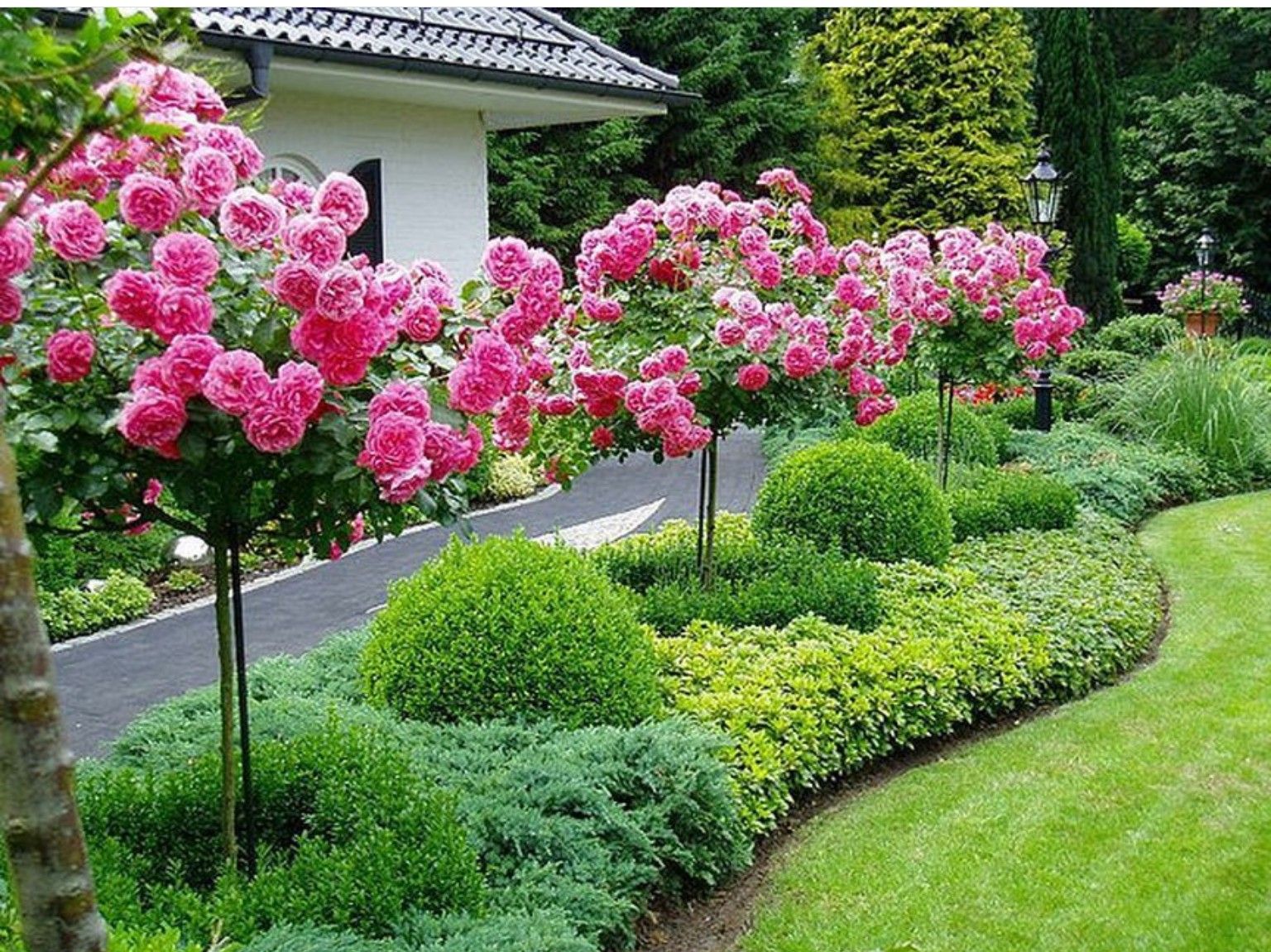 Standardroser i hagedesign vil pryde ethvert sted. De ser bra ut på bakgrunn av en plen innrammet av dvergeroser og bakkeplanter. Stilkene er plantet langs stier og stier, brukt som en bendelormplante i en miksegrense.