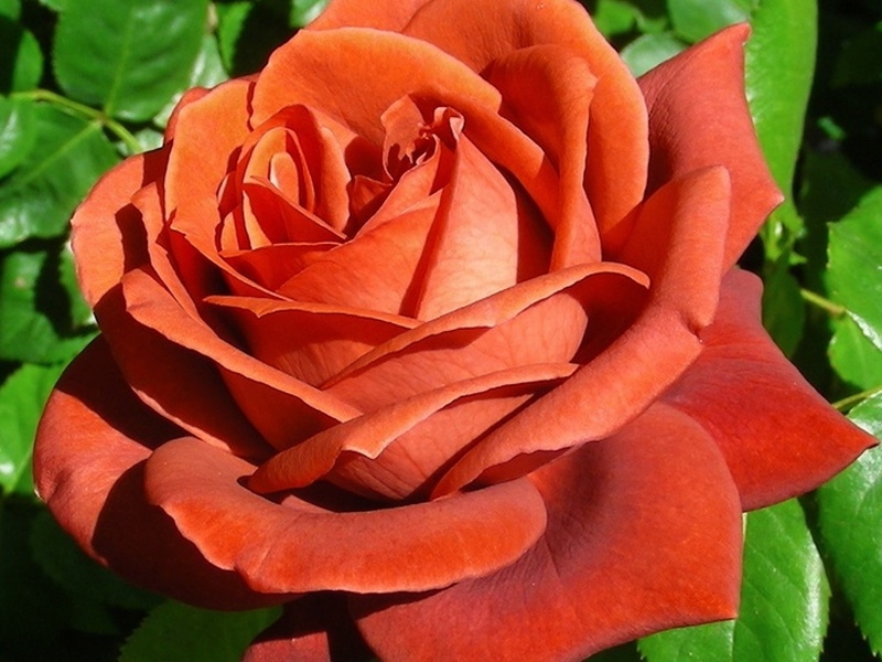 Ved navnet på blomsten er det lett å gjette om fargen. Knoppen er ganske stor. Den har en klassisk form med et høyt senter og doble kronblader av en mursteinskygge, hvorav det kan være mer enn 50. Åpningen av blomsterhodet når 14 cm i diameter. Enkelt knopper, ingen aroma. Rett busk, høy. Vokser opptil 1 m i høyden. Det er ikke mange torner. Har et tett blankt løvverk. Den blomstrer lenge og rikelig. Blomstrende nyanser fra lys oransje til kanel med mørke kanter på kronbladene.