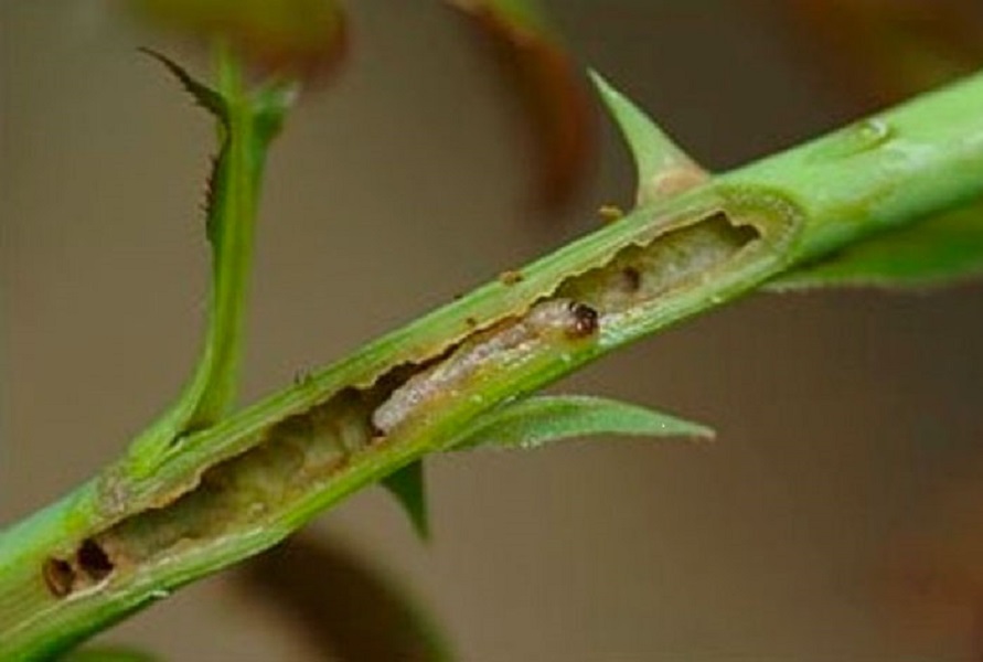Hunnen legger egg på toppen av unge stengler, og gir larvene den beste maten. De gnager skudd. De blir introdusert i stammen. Det blir mørkt og tørker opp.