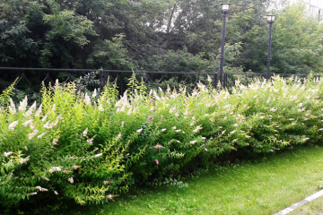 Spirea suppleres godt av andre planter, både minimalistiske bartrær og frodige blomstrende busker. Lyse spireas tiltrekker seg oppmerksomhet, de kan skjule bladløse og bare deler av trær.