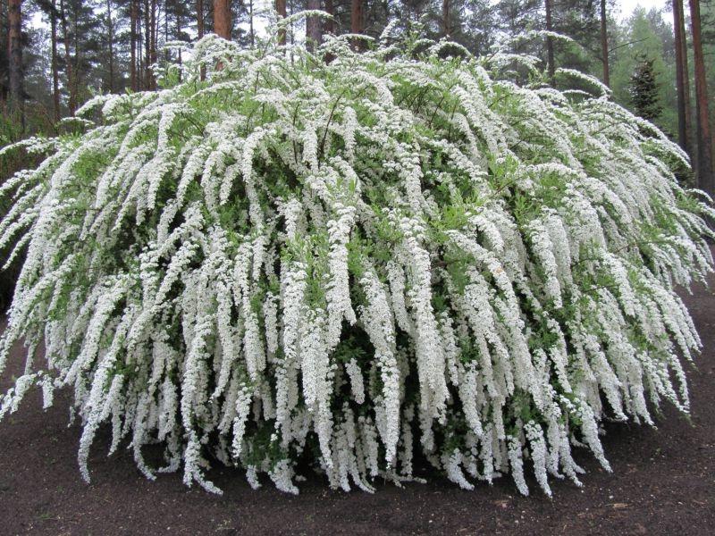 Den har snøhvite doble blomster (ligner kirsebærblomster) som omgir grenene tett. Blomster med liten diameter opp til 1 cm er gruppert i blomsterblomstrer. Blomstringen varer 7-8 uker fra mai til juni. Tørre blomster faller lett av.
