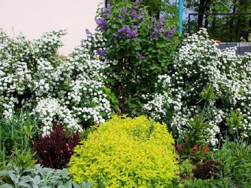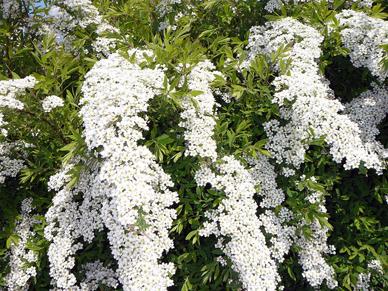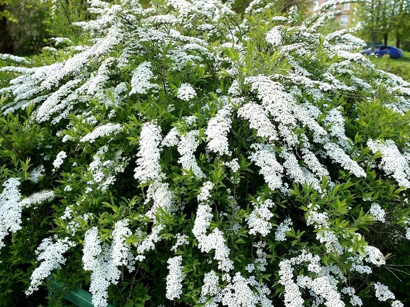 - Spirea Wangutta White Bride. En populær dekorativ busk verdsatt for sine hvite blomster. Den maksimale høyden overstiger ikke 2 m. Sorten er lite krevende til bakken, den tåler tørke godt.