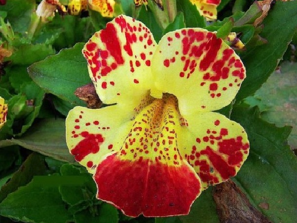 Det kalles også mimulus tigrinus, storblomstret mimulus, leopardmimulus, hybridmimulus (Mimulus hybridus), mimulus maximus. Det er den mest populære sorten, som er spesielt elsket av blomsteravlere i hagen. En årlig plante. Buskenes høyde er 20-25 cm. Blomstrer ser ut som børster. Knoppene har en variert farge, men alltid variert. Blomstringen varer fra mai til juli.