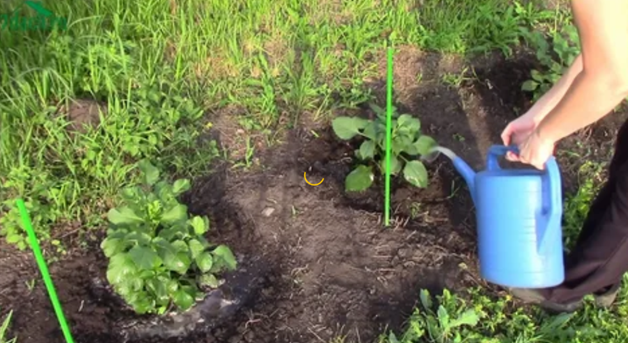 - в основата на храста се изкопава в кръг бразда с дълбочина 10-15 см и се полива обилно с вода;