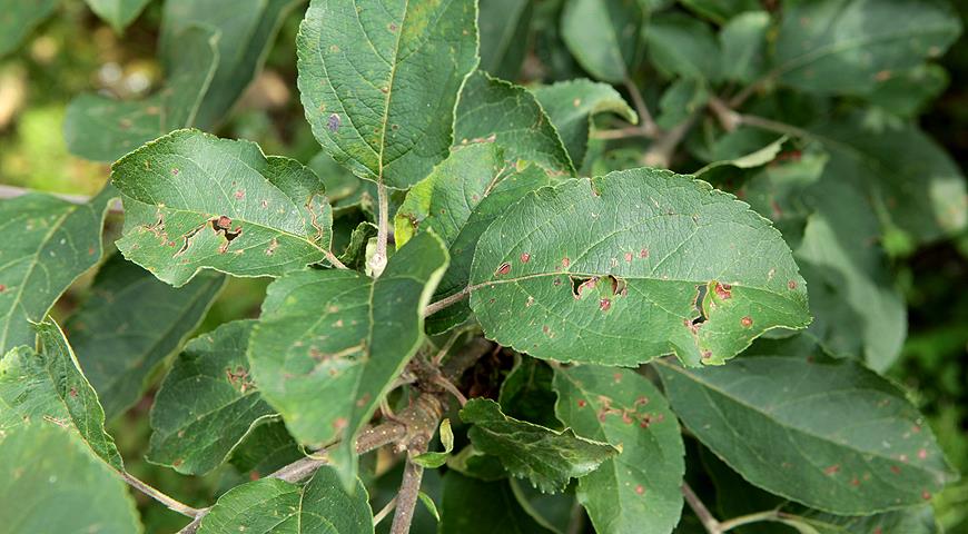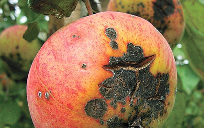 - Deformação das frutas, sua perda de aparência, sabor e benefício. Manchas escuras aparecem nas maçãs, que aumentam gradualmente de tamanho e número. Manchas escuras desaparecem com o tempo e podem se formar orifícios em seu lugar.