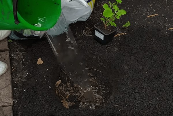O arbusto deve ficar imerso no solo, enterrando as raízes ao nível do solo - não deve ser enterrado no solo nem se destacar como um morro.A planta, junto com a massa de terra "nativa", é movida para o buraco preparado, o lúmen é preenchido com solo nutritivo, regado generosamente, mas não compactado. 1 arbusto, dependendo de seu tamanho, leva de 1 a 4 baldes de água.