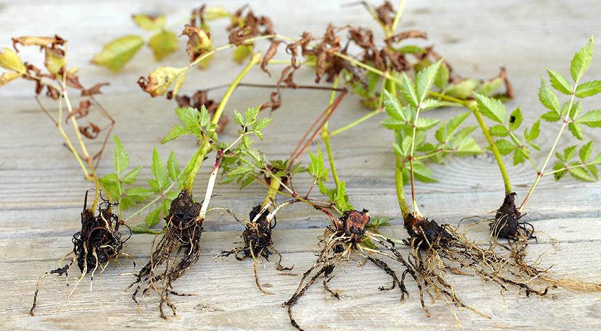 Além da cobertura no início do outono, outra etapa importante é a poda da seção de solo do arbusto. É realizada com poda, que é desinfetada em solução rosa de potássio azedo manganês por meia hora após cada flor para prevenir possíveis infecções. Pode ser introduzida durante a floração ou pode ser causada por um fungo que surge como resultado da água estagnada no solo. É também uma das razões para o fraco crescimento, secagem, deformação e amarelecimento das folhas.